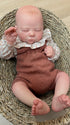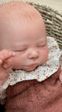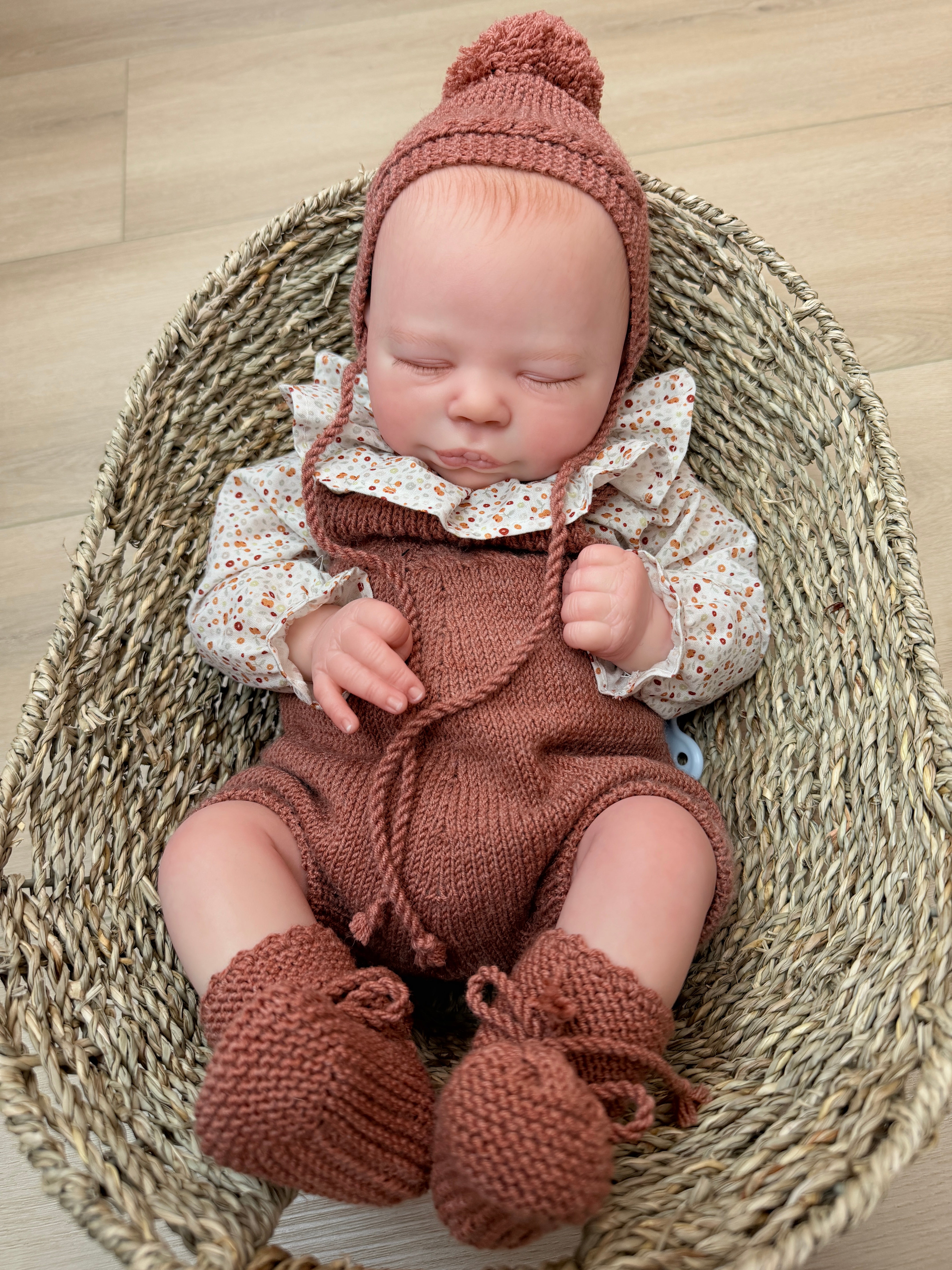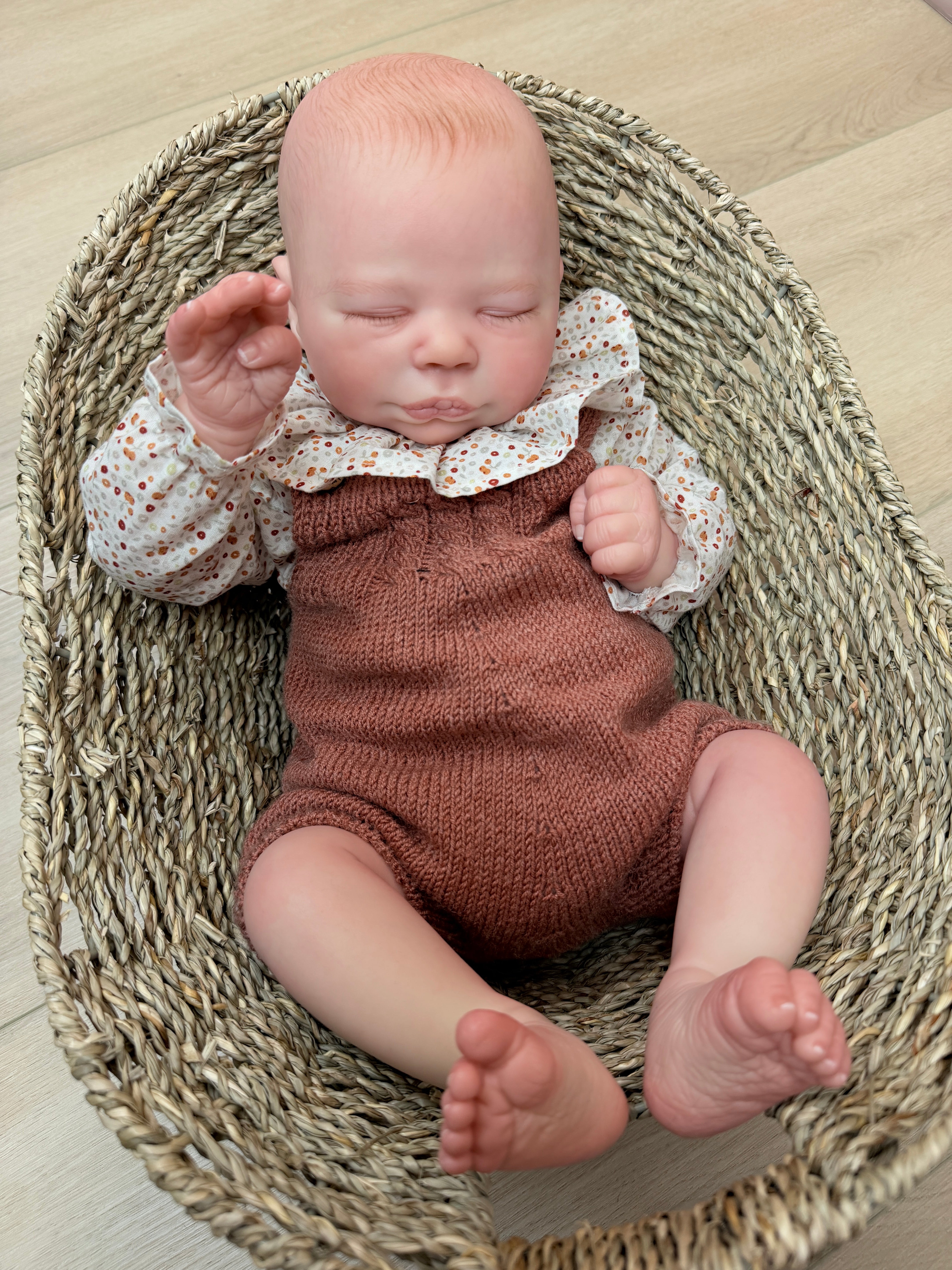 Pure sweetness from the very first moment. Bryson is a newborn reborn baby boy with the peaceful expression of a little one just hours old. His skin glows with lifelike warmth, each layer hand-painted to capture the rosy flush across his cheeks, the delicate creases of his tiny knuckles, and the subtle translucency that makes newborn skin so unmistakable. Micro-rooted blonde hair creates the softest wispy crown, while hand-placed lashes rest gently over his closed eyes. Dressed in a cozy rust knit romper with a sweet polka dot collar, Bryson nestles perfectly in his woven basket—fingers curled, toes flexed, every detail crafted to make you believe he's dreaming. This is heirloom-quality realism, made to be treasured for generations.